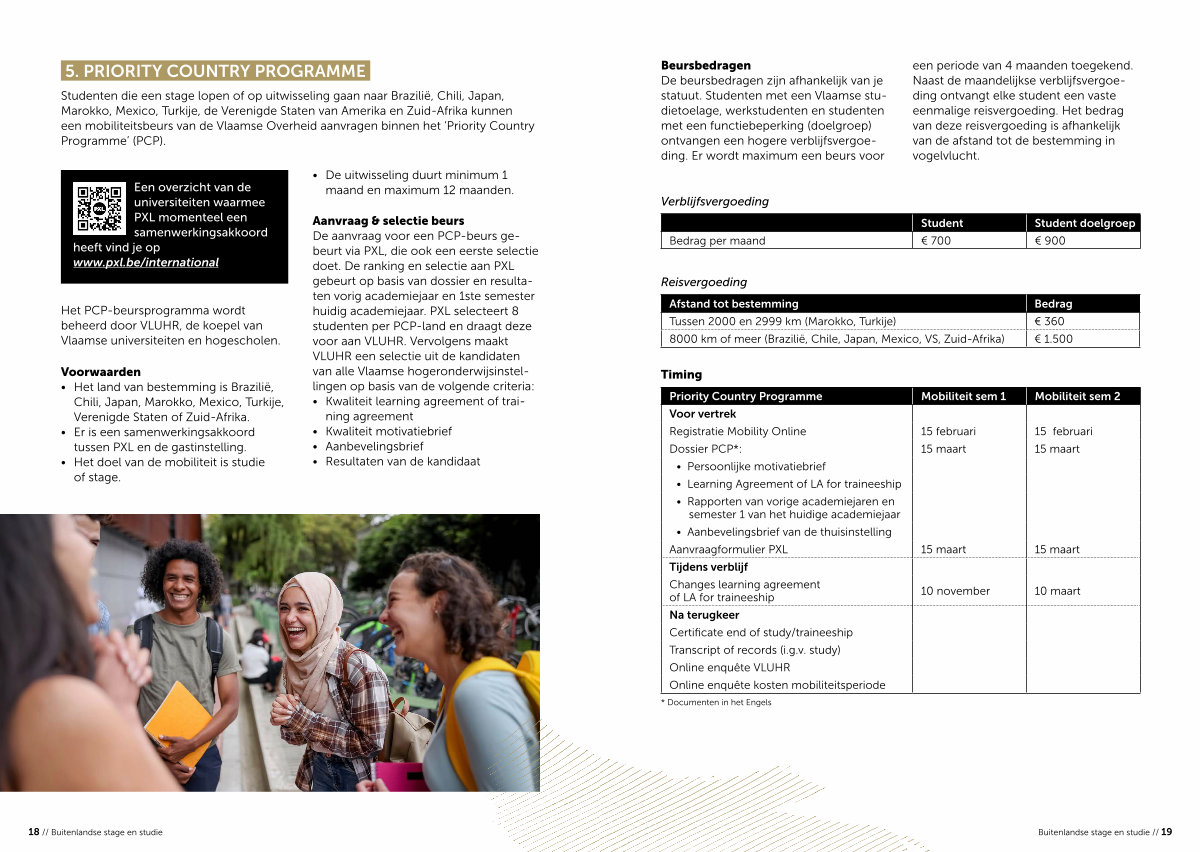 Studenten die een stage lopen of op uitwisseling gaan naar Brazilië, Chili, Japan, Marokko, Mexico, Turkije, de Verenigde Staten van Amerika en Zuid-Afrika kunnen een mobiliteitsbeurs van de Vlaamse Overheid aanvragen binnen het‘ Priority Country Programme’( PCP).