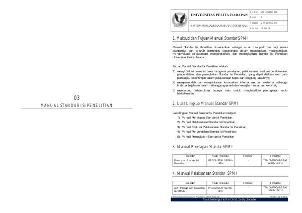 Manual Standar Isi Penelitian dimaksudkan sebagai acuan dan pedoman bagi sivitas akademika dan seluruh pemangku kepentingan dalam menetapkan, melaksanakan, mengevaluasi pelaksanaan, mengendalikan, dan meningkatkan Standar Isi Penelitian Universitas Pelita Harapan.