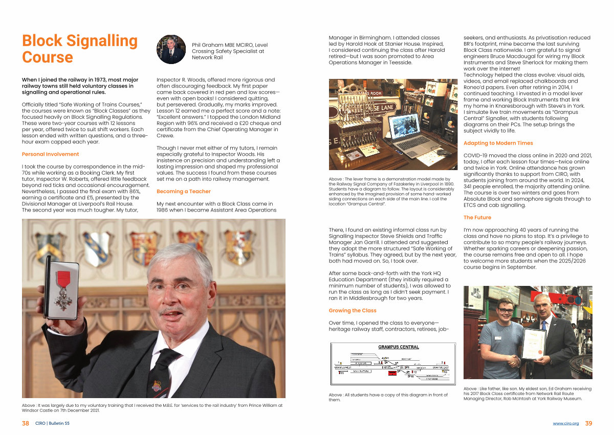 Officially titled“ Safe Working of Trains Courses,” the courses were known as“ Block Classes” as they focused heavily on Block Signalling Regulations. These were two-year courses with 12 lessons per year, offered twice to suit shift workers. Each lesson ended with written questions, and a threehour exam capped each year.