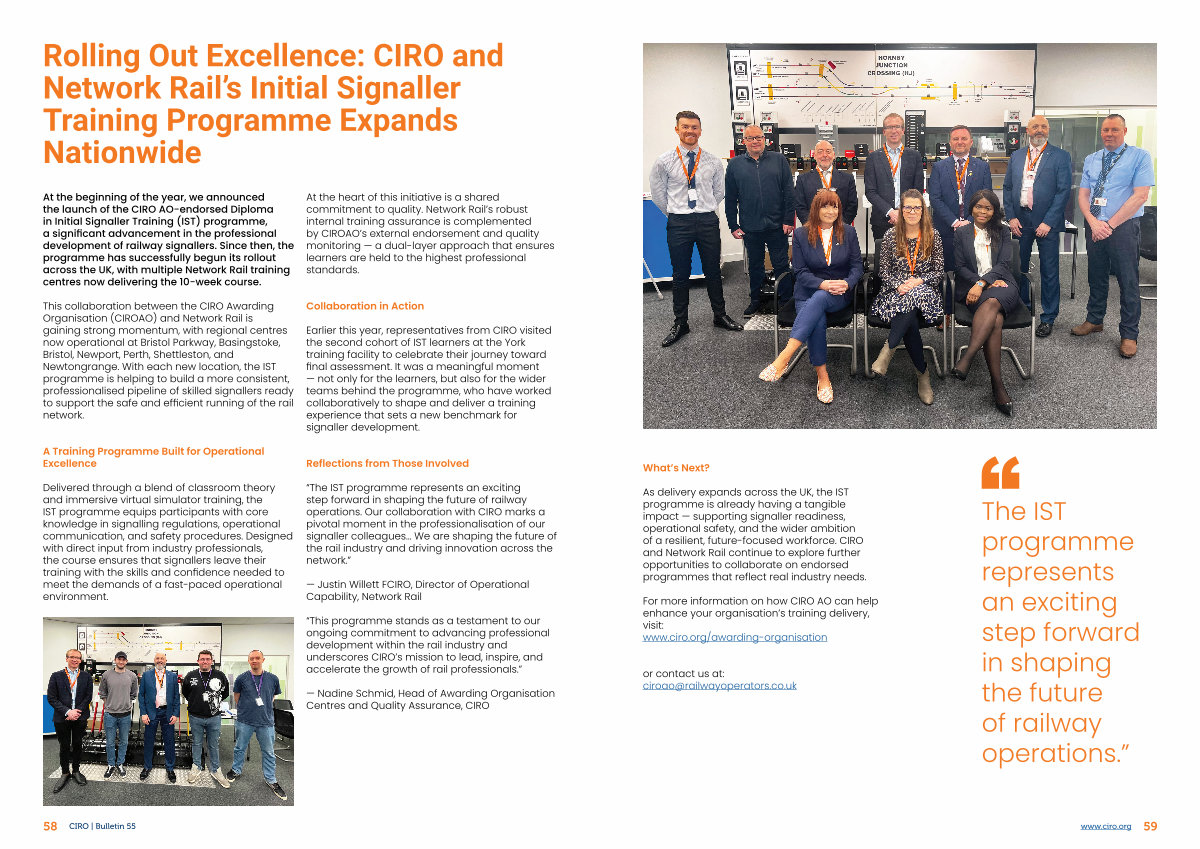At the beginning of the year, we announced the launch of the CIRO AO-endorsed Diploma in Initial Signaller Training( IST) programme, a significant advancement in the professional development of railway signallers. Since then, the programme has successfully begun its rollout across the UK, with multiple Network Rail training centres now delivering the 10-week course.