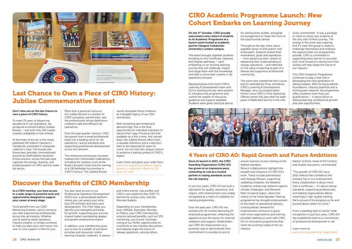 Over the past year, CIRO AO has worked with 10 centres delivering 22 endorsed programmes, reflecting the appetite across the sector for external validation and support. Stakeholders see CIRO AO endorsement as a powerful way to demonstrate their commitment to excellence and to ensure learners receive training of the highest standard. Recent collaborations highlight the breadth and influence of CIRO AO’ s work. These include partnerships with Railway Mission, supporting wellbeing initiatives; the Weather Academy, enhancing resilience against climate challenges; and Network Rail’ s Scotland region, where the rollout of the Initial Signaller Training programme has brought endorsement to the heart of operational delivery. Looking ahead, demand for endorsement continues to grow, with more organisations and training providers seeking to work with CIRO AO on innovative programmes that meet the evolving needs of the rail industry.