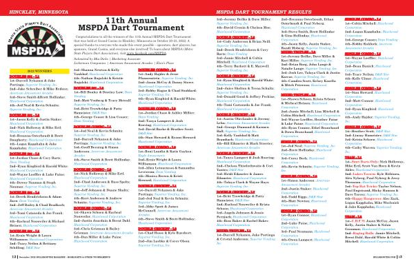 TEAM - L1 1st--Smrt Darts Only : Nick Holloway , Mike Ertl , Scott Van Horn & Kevin Ahles ; Hazelwood Corporation 2nd--Lukes Tavern : Kyle Riihinen , Alex Nyberg , Paul Nyberg & Jerry Thronson ; Hazelwood Corporation 3rd--Top Hat Tricks : Taylor Nelson , Paul Engstrand , Micky Hanson & Dave Torrez ; Superior Vending , Inc . 4th--Happy Hangovers : Alec Zack , Logan Kapphahn , Mike Wochnick & Jake Kapphahn ; Hazelwood Corporation