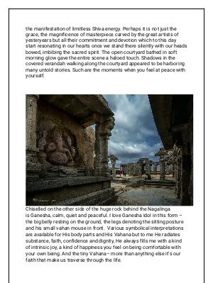 themanifestationoflimitlessShivaenergy. Perhapsitisnotjustthe grace, themagnificenceofmasterpiececarvedbythegreatartistsof yesteryearsbutaltheircommitmentanddevotionwhichtothisday startresonatinginourheartsoncewestandtheresilentlywithourheads bowed, imbibingthesacredspirit. Theopencourtyardbathedinsoft morningglowgavetheentiresceneahaloedtouch. Shadowsinthe coveredverandahwalkingalongthecourtyardappearedtobeharboring manyuntoldstories. Sucharethemomentswhenyoufeelatpeacewith yourself.