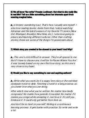 6) Wealknow‘ thewriter’ FreesiaLockheart. Butwhatissherealylike inreallife? Telusalitlesomethingaboutherinterestsapartfrom weavingmagicaltales.