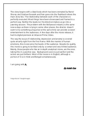 ThestorybeginswithadeadbodywhichhasbeencrematedbyRanvir ShoreyandGulshanDevaiahandthengoesintotheflashbackwherethe mainstorylies. Therelationshipbetweeneachofthecharactersis perfectlyexecuted. Mostthingshavebeenshowcasedandframedina perfectway. Neithertheleadsnorthedirectionmakesusgointoa yawningsession. Theproblem withtheBolywoodindustryisthesame now-a-daysasthereislyinginsomeotherplaces, thedirectordoesn’ t wanttotrysomethinguniquebutatthesametimecanprovideasweet entertainmenttotheaudiences. Afewdaysafterthemovierelease, it haditsdigitalpremiereatAmazonPrimeVideo.