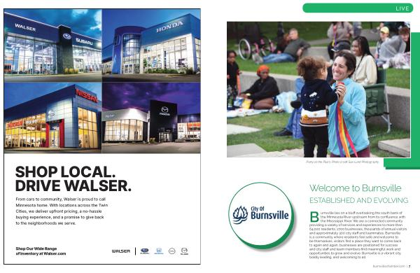 Burnsville lies on a bluff overlooking the south bank of the Minnesota River upstream from its confluence with the Mississippi River. We are a connected community providing a variety of services and experiences to more than 64,000 residents, 2700 businesses, thousands of annual visitors and approximately 300 city staff and teammates. Burnsville is a community where residents feel safe and welcome to be themselves, visitors find a place they want to come back to again and again, businesses are positioned for success and city staff and team members find meaningful work and opportunities to grow and evolve. Burnsville is a vibrant city, boldly leading, and welcoming to all. burnsvillechamber. com | 7