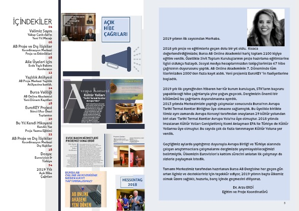 Tamamı Merkezimiz tarafından hazırlanan Bursa AB Dergisine her geçen gün artan ilginiz ve destekleriniz için teşekkür ediyor, 2019 yılının başta ülkemiz olmak üzere sağlıklı, huzurlu, barış içinde geçmesini diliyoruz.