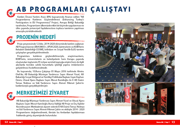 Bu kapsamda; 10.Bursa Çalıştayı 05 Mayıs 2016 tarihinde Almira Otel'de; AB Bakanlığı Müsteşar Yardımcısı Sayın Ahmet Yücel, AB Bakanlığı Sosyal Bölgesel ve Yenilikçi Politikalar Başkanı Sayın Kayhan Özüm, Ulusal Ajans Başkanı Sayın Mesut Kamiloğlu ile İl AB Daimi Temas Noktası ve Vali Yardımcısı Sayın Ahmet Hikmet Şahin'in katılımlarıyla gerçekleştirilmiştir.