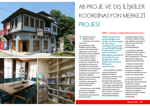 2014 yılında Bursa Valiliği ve Bursa Büyükşehir Belediyesi arasında imzalanan protokol ile eski eser tescilli, Osmanlı döneminin ilk sivil mimari örneğini teşkil eden binanın aslına uygun olarak AB Proje ve Dış İlişkiler Koordinasyon Merkezi’nin kullanımına tahsis edilmiş ve binanın iç teşrifatı Bursa Eskişehir Bilecik Kalkınma Ajansı tarafından sağlanan hibe desteği ile kullanıma hazır hale getirilmiş olup açılışı 9 Mayıs Avrupa Günü'nde resmi törenle gerçekleştirilmiştir.