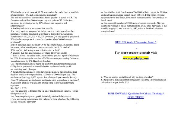 What is the present value of $ 1.21 received at the end of two years if the interest rate is 10 % and compounding is annual? The price elasticity of demand for a firm ' s product is equal to 1.8. The firm currently sells 4,000 units per day at a price of $ 2. If the firm increases its product price by 10 %, then it can expect to sell approximately A leading indicator is a measure that usually A security system company’ s total production costs depend on the number of systems produced according to the following equation, Total costs = $ 10,000,000 + $ 2,000 Q where Q is the quantity produced. What is the average total cost of production when 20,000 uits are produced? Buyers consider gasoline and SUV to be complements. If gasoline price increases, what would you expect to occur in the SUV market? Which of the following is an explicit cost to a firm? A country that has an abundance of cheap labor will tend to If Sam’ s, a local watering hole, increased the price of a pint of Guinness by 20 %, it estimates the number of MBA students purchasing Guinness would decrease by 4 %. Based on this data Use the information about marginal cost( MC) and marginal revenue( MR) that is presented in the table below to determine the profit maximizing level of output. A baseketball company is considerign purchasing a new machine that doubles capacity from producing 100 balls to 200 balls per day. The machine will occupy 1,000 square feet of unused space on the facotry floor. Which costs are irrelevant in this decision to purchase a machine? Regression analysis was used to estimate the following linear trend equation: St = 10.5 + 0.25 t Use this equation to forecast the value of the dependent variable( St) in time period of 10 In a freeenterprise system, profit is socially desirable because it If you are trying to determine the value of a firm, which of the following factors would be relevant?