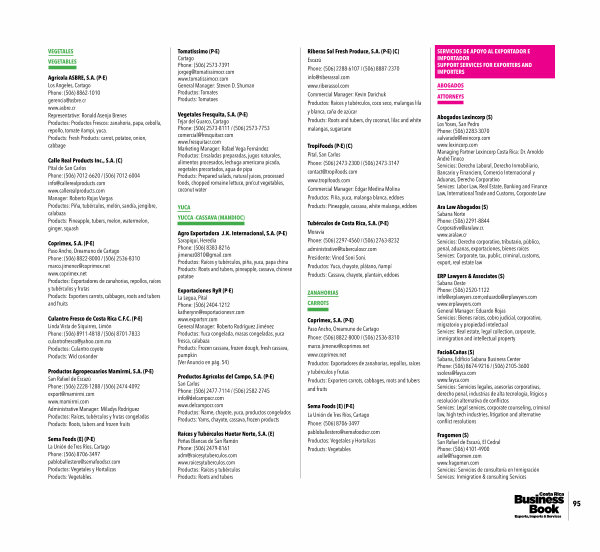 Tubérculos de Costa Rica, S. A.( P-E) Moravia Phone:( 506) 2297-4560 /( 506) 2763-8232 administrativo @ tuberculoscr. com Presidente: Vinod Soni Soni. Productos: Yuca, chayote, plátano, ñampí Products: Cassava, chayote, plantain, eddoes
