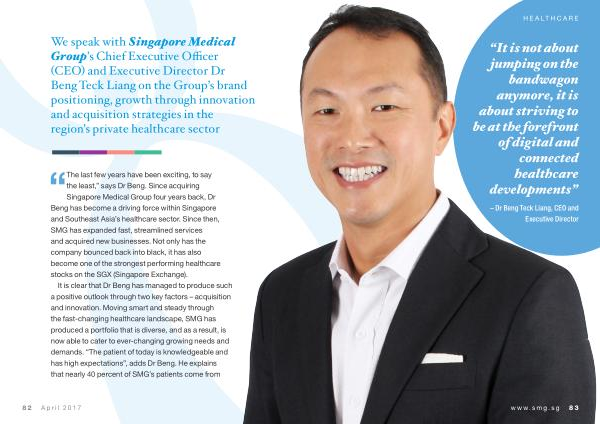 We speak with Singapore Medical Group ’ s Chief Executive Officer ( CEO ) and Executive Director Dr Beng Teck Liang on the Group ’ s brand positioning , growth through innovation and acquisition strategies in the region ’ s private healthcare sector