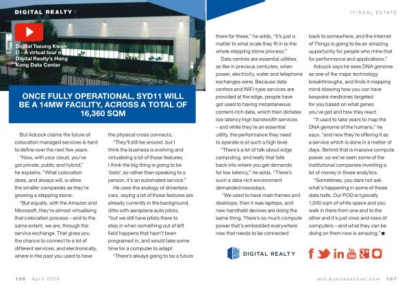 “ Sometimes , you dare not ask what ’ s happening in some of those data halls . Our POD is typically 1,000 sqm of white space and you walk in there from one end to the other and it ’ s just rows and rows of computers – and what they can be doing on them now is amazing .” anz . businesschief . com 107