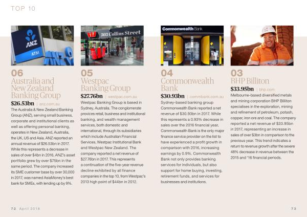Group ( ANZ ), serving small business , corporate and institutional clients as well as offering personal banking , operates in New Zealand , Australia , the UK , US and Asia . ANZ reported an annual revenue of $ 26.53bn in 2017 . While this represents a decrease in sales of over $ 4bn in 2016 , ANZ ’ s asset portfolio grew by over $ 75bn in the same period . The company increased its SME customer base by over 30,000 in 2017 , was named AsiaMoney ’ s best bank for SMEs , with lending up by 9 %.