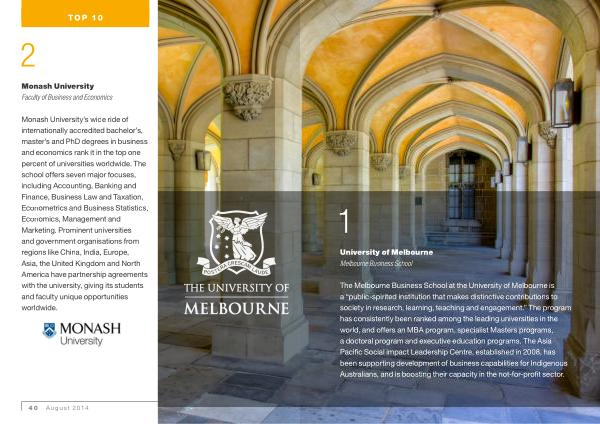 The Melbourne Business School at the University of Melbourne is a “ public-spirited institution that makes distinctive contributions to society in research , learning , teaching and engagement .” The program has consistently been ranked among the leading universities in the world , and offers an MBA program , specialist Masters programs , a doctoral program and executive education programs . The Asia Pacific Social impact Leadership Centre , established in 2008 , has been supporting development of business capabilities for Indigenous Australians , and is boosting their capacity in the not-for-profit sector .