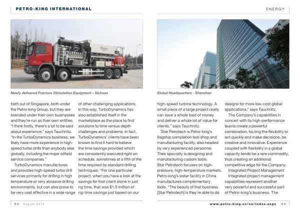 both out of Singapore , both under the Petro-king Group , but they are branded under their own businesses and they ’ re run as their own entities . “ I think firstly , there ’ s a lot to be said about experience ,” says Tauchnitz . “ In the TurboDynamics business , we likely have more experience in highspeed turbo drills than anybody else globally , including the major oilfield service companies .”
