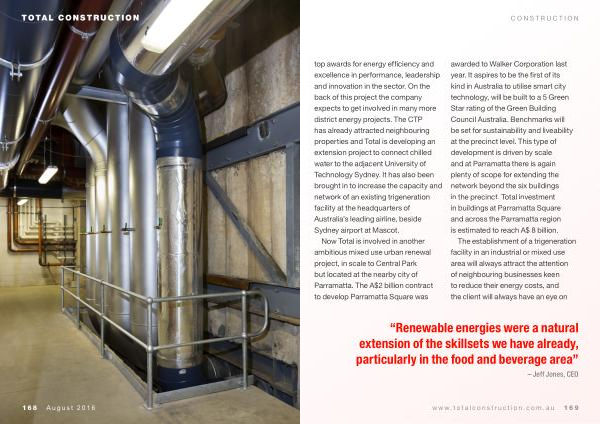 CONSTRUCTION top awards for energy efficiency and excellence in performance , leadership and innovation in the sector . On the back of this project the company expects to get involved in many more district energy projects . The CTP has already attracted neighbouring properties and Total is developing an extension project to connect chilled water to the adjacent University of Technology Sydney . It has also been brought in to increase the capacity and network of an existing trigeneration facility at the headquarters of Australia ’ s leading airline , beside Sydney airport at Mascot .
