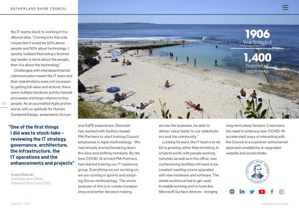 — Simona Dimovski , Chief Information Officer , Sutherland Shire Council ( SSC ) and SaFE experience , Dimovski has worked with Sydney-based PM-Partners to start training Council employees in Agile methodology . “ We had already started breaking down the silos and shifting mindsets . By the time COVID-19 arrived PM-Partners had started training our IT resilience group . Everything we are working on , we are running in sprints and adopting Scrum methodology . The whole purpose of this is to create transparency and better decision making