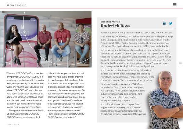 Sitting at the intersection of the Pacific , US and Asian markets , DOCOMO PACIFIC has access to a wealth of different cultures , perspectives and skill sets . “ We have a very diverse organisation . We have people from all over Asia , from the local Chamorro population , a big Filipino population as well as distinct Korean and Japanese demographics . So , add to that all the military personnel that come and go and you have a very diverse and dynamic little island ,” says Boss . “ I feel like that diversity is a real strength in our operation . It allows for innovation and a very respectful environment . I think that ’ s something that DOCOMO PACIFIC puts a lot of value in .”