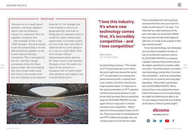 One example of that is the “ 2020 Olympics . We were hoping to get the sponsorship to be the official telecom supplier to the Guam National Olympic Committee . This is managed by the IOC , and they charge astronomical fees for these sponsorships . We were hoping that they would understand that we ’ re a tiny market with our own Olympic team separate from the US . We thought that with it being so close to us geographically , and with us being part of a Japanese telco , it would be a great sponsorship opportunity . It actually turned out very well ; they were able to understand our scale and give us a rate we could afford . Now , we ’ re Guam ’ s official telecommunications sponsor for Team Guam to the Summer Olympics event . We need a lot more of our partners to recognize that we need worldclass products and support , but at small island prices .”