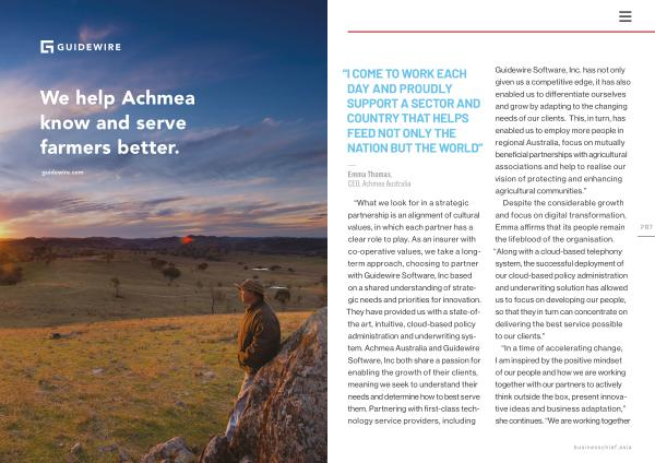 “ What we look for in a strategic partnership is an alignment of cultural values , in which each partner has a clear role to play . As an insurer with co-operative values , we take a longterm approach , choosing to partner with Guidewire Software , Inc based on a shared understanding of strategic needs and priorities for innovation . They have provided us with a state-ofthe art , intuitive , cloud-based policy administration and underwriting system . Achmea Australia and Guidewire Software , Inc both share a passion for enabling the growth of their clients , meaning we seek to understand their needs and determine how to best serve them . Partnering with first-class technology service providers , including