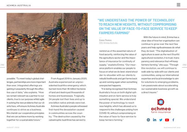 292 possible . “ To meet today ’ s global challenges , partnerships are more important than ever . Integrated offerings are gaining in popularity through the effective use of data ,” she explains . “ How we remain relevant as a partner to our clients , true to our purpose whilst agile in solving the new problems that our clients face , will ensure Achmea Australia continues to strive as a business . We cherish our cooperative principles that we can achieve more by working together for a sustainable future .”