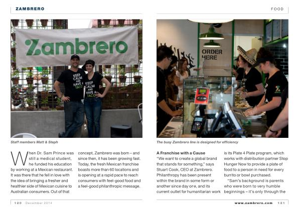 A Franchise with a Cause “ We want to create a global brand that stands for something ,” says Stuart Cook , CEO at Zambrero . Philanthropy has been present within the brand in some form or another since day one , and its current outlet for humanitarian work is its Plate 4 Plate program , which works with distribution partner Stop Hunger Now to provide a plate of food to a person in need for every burrito or bowl purchased .
