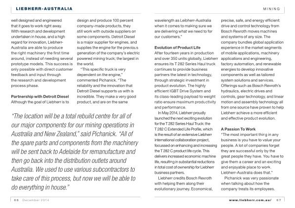 well designed and engineered that it goes to work right away . With research and development undertaken in house , and a high regard for innovation , Liebherr- Australia are able to produce the right machinery the first time around , instead of needing several prototype models . This success is only possible with direct customer feedback and input through the research and development process phase .