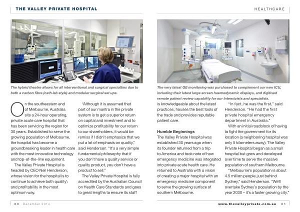 On the southeastern end of Melbourne , Australia sits a 24-hour operating , private acute care hospital that has been servicing the region for 30 years . Established to serve the growing population of Melbourne , the hospital has become a groundbreaking leader in health care with the most innovative technology and top-of-the-line equipment .
