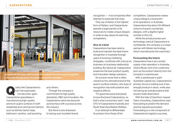 “ It ’ s good because everybody knows the brand Caesarstone , so that ’ s what consumers want ,” said CFO of Caesarstone Australia and South East Asia Moshe Wolfson . In an attempt to differentiate its product from those of the competition , Caesarstone makes unique designs a focal point of its operations . In Australia , Caesarstone has about 50 different colours of quartz countertop designs , with a slightly higher number in the U . S .