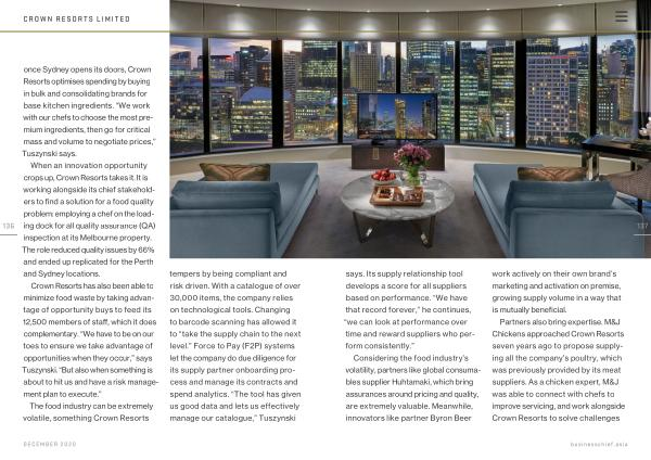 136 once Sydney opens its doors , Crown Resorts optimises spending by buying in bulk and consolidating brands for base kitchen ingredients . “ We work with our chefs to choose the most premium ingredients , then go for critical mass and volume to negotiate prices ,” Tuszynski says .