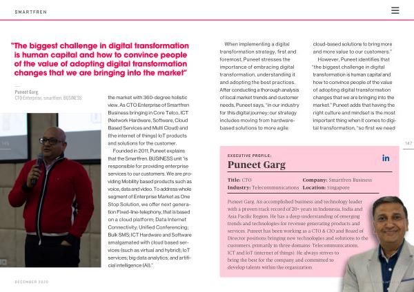 — Puneet Garg , CTO Enterprise , smartfren . BUSINESS the market with 360-degree holistic view . As CTO Enterprise of Smartfren Business bringing in Core Telco , ICT ( Network Hardware , Software , Cloud Based Services and Multi Cloud ) and ( the internet of things ) IoT products and solutions for the customer .