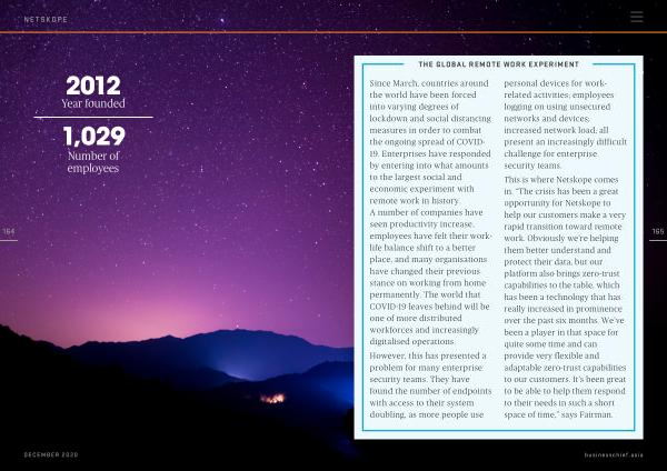 Since March , countries around the world have been forced into varying degrees of lockdown and social distancing measures in order to combat the ongoing spread of COVID- 19 . Enterprises have responded by entering into what amounts to the largest social and economic experiment with remote work in history . A number of companies have seen productivity increase , employees have felt their worklife balance shift to a better place , and many organisations have changed their previous stance on working from home permanently . The world that COVID-19 leaves behind will be one of more distributed workforces and increasingly digitalised operations . However , this has presented a problem for many enterprise security teams . They have found the number of endpoints with access to their system doubling , as more people use personal devices for workrelated activities ; employees logging on using unsecured networks and devices ; increased network load ; all present an increasingly difficult challenge for enterprise security teams . This is where Netskope comes in . “ The crisis has been a great opportunity for Netskope to help our customers make a very rapid transition toward remote work . Obviously we ’ re helping them better understand and protect their data , but our platform also brings zero-trust capabilities to the table , which has been a technology that has really increased in prominence over the past six months . We ’ ve been a player in that space for quite some time and can provide very flexible and adaptable zero-trust capabilities to our customers . It ’ s been great to be able to help them respond to their needs in such a short space of time ,” says Fairman .