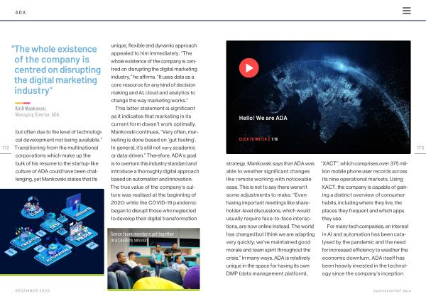 173 strategy , Mankovski says that ADA was able to weather significant changes like remote working with noticeable ease . This is not to say there weren ’ t some adjustments to make : “ Even having important meetings like shareholder-level discussions , which would usually require face-to-face interactions , are now online instead . The world has changed but I think we are adapting very quickly ; we ’ ve maintained good morale and team spirit throughout the crisis .” In many ways , ADA is relatively unique in the space for having its own DMP ( data management platform ),