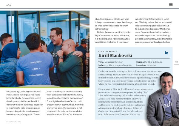 Data is the core asset that is helping ADA achieve its vision . Moreover , it is the company ’ s rigorous analytical capabilities that allow it to extract valuable insights for its clients to act on . “ We truly believe that an automated decision-making process allows us to make better decisions ,” Mankovski says . Capable of controlling multiple essential aspects of the marketing process automatically , including media planning , placement and production ,