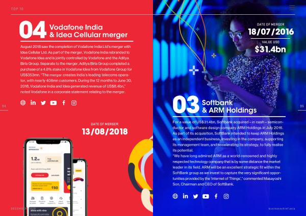 August 2018 saw the completion of Vodafone India Ltd ’ s merger with Idea Cellular Ltd . As part of the merger , Vodafone India rebranded to Vodafone Idea and is jointly controlled by Vodafone and the Aditya Birla Group . Separate to the merger , Aditya Birla Group completed a purchase of a 4.8 % stake in Vodafone Idea from Vodafone Group for US $ 353mn . “ The merger creates India ’ s leading telecoms operator , with nearly 408mn customers . During the 12 months to June 30 , 2018 , Vodafone India and Idea generated revenue of US $ 8.4bn ,” noted Vodafone in a corporate statement relating to the merger . 94