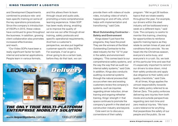 Kings doesn ’ t just have the programs , they have the proof . They are the winners of the Most Outstanding Contractor to the steel industry for the ‘ 13 /’ 14 year in the safety and environment category . “ This comes back to our comprehensive safety systems , and the way the way that we audit our internal safety systems ,” said Cole . In addition , Kings also conducts auditing via external systems through the natural process that occurs when new and existing customers review the company ’ s systems , such as inquiries regarding driver induction , driver training and ongoing refresher training . Kings ’ strength in that space continues to promote the company ’ s growth in the steel and construction industry and beyond .