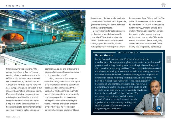 Hindustan Zinc ’ s operations . “ The unique thing here is that we ’ re connecting all our operating people with OEMs , subject matter expertise and our data scientists ,” explains Gorain . “ OSIsoft and ABB are helping us to connect our operating data across all of our mines , mills , smelters and power plants . It ’ s a crucial initiative because , along with insights , we ’ ll be able to predict things in real-time and collaborate in a way that allows us to maximise the benefit that digital solutions from SMEs can have in helping us to optimise our operations . ABB , as one of the world ’ s top experts in control innovation , is supporting us on this quest .”
