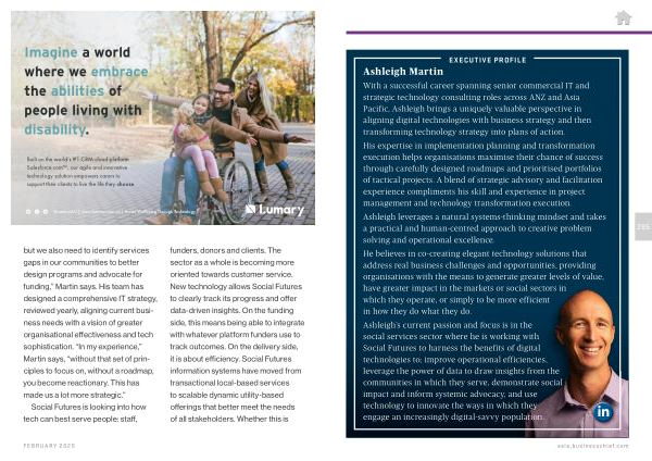With a successful career spanning senior commercial IT and strategic technology consulting roles across ANZ and Asia Pacific , Ashleigh brings a uniquely valuable perspective in aligning digital technologies with business strategy and then transforming technology strategy into plans of action . His expertise in implementation planning and transformation execution helps organisations maximise their chance of success through carefully designed roadmaps and prioritised portfolios of tactical projects . A blend of strategic advisory and facilitation experience compliments his skill and experience in project management and technology transformation execution . Ashleigh leverages a natural systems-thinking mindset and takes a practical and human-centred approach to creative problem solving and operational excellence . He believes in co-creating elegant technology solutions that address real business challenges and opportunities , providing organisations with the means to generate greater levels of value , have greater impact in the markets or social sectors in which they operate , or simply to be more efficient in how they do what they do . Ashleigh ’ s current passion and focus is in the social services sector where he is working with Social Futures to harness the benefits of digital technologies to ; improve operational efficiencies , leverage the power of data to draw insights from the communities in which they serve , demonstrate social impact and inform systemic advocacy , and use technology to innovate the ways in which they engage an increasingly digital-savvy population .