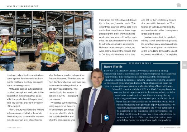 ( Mineral Economics ), and the AICD ’ s and MIoD Company Directors courses . Barry ’ s experience within the mining industry includes varied roles in both coal and metalliferous mining , during which he gained First Class Mine Managers certification for all four of the Australian jurisdictions he worked in . With a focus on safely increasing mine physicals , improving standards , cost reduction , technical improvements and system optimisation , he is applying all this experience to his current role as the COO of New Century Resources assets , focused on leading the company in all facets of the restarting of operations ; again establishing Century as a significant world zinc producer .