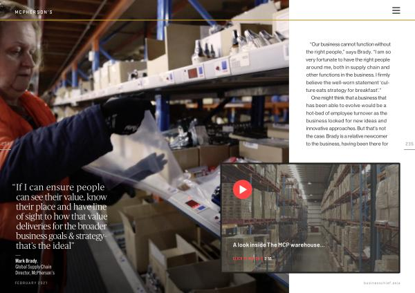 “ Our business cannot function without the right people ,” says Brady . “ I am so very fortunate to have the right people around me , both in supply chain and other functions in the business . I firmly believe the well-worn statement ‘ culture eats strategy for breakfast ’.”