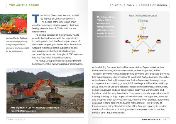 Anitua Mining Services , Anitua Hardware , Anitua Supermarket , Anitua Protective Services , Anitua Investments , Anitua Properties , Anitua Transport Services , Anitua Radial Drilling Services , Lihir Business Services , Lihir Auto Services , Lihir Investments ( Australia ), Anitua Logistics ( Australia ), Anitua Motors , Anitua Constructions , Anitua Farms and the mega camp management and catering groups , NCS Holdings and The Alliance Group ( TAG ). The Anitua Group ’ s services include contract mining , construction , security , roadwork and civil construction , quarrying , warehousing and logistics , retail , farming , hospitality , IT services , mine site support and earth moving , training , drilling , property investment and management , transport and shipping , small business services , catering , fresh produce , automotive sales and repairs , catering and camp management – the diversity of these services being clearly indicative of the Group ’ s capacity to provide solutions for all aspects of mining and resource projects not to mention those in other industries as well . www . anitua . com 217