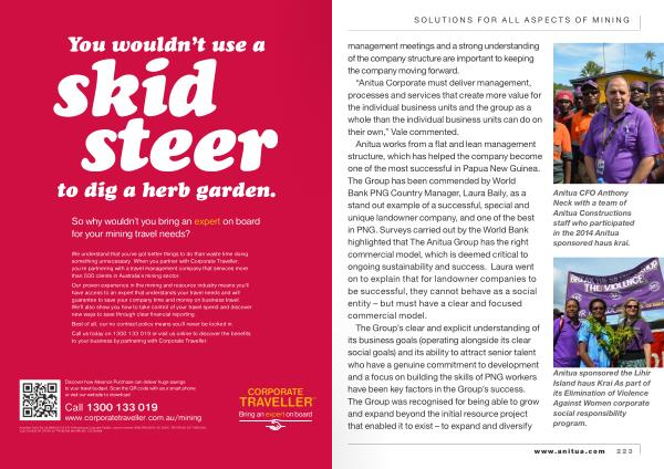 Anitua works from a flat and lean management structure , which has helped the company become one of the most successful in Papua New Guinea . The Group has been commended by World Bank PNG Country Manager , Laura Baily , as a stand out example of a successful , special and unique landowner company , and one of the best in PNG . Surveys carried out by the World Bank highlighted that The Anitua Group has the right commercial model , which is deemed critical to ongoing sustainability and success . Laura went on to explain that for landowner companies to be successful , they cannot behave as a social entity – but must have a clear and focused commercial model .