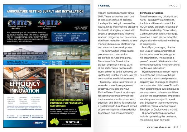 Report , published annually since 2011 , Tassal addresses each one of these concerns and outlines the steps it is taking to resolve the issues . It has implemented proactive fish health strategies , worked with acoustic specialists and invested in sound mitigation , and has seen a significant reduction in bird and seal mortality because of staff training and infrastructure development .