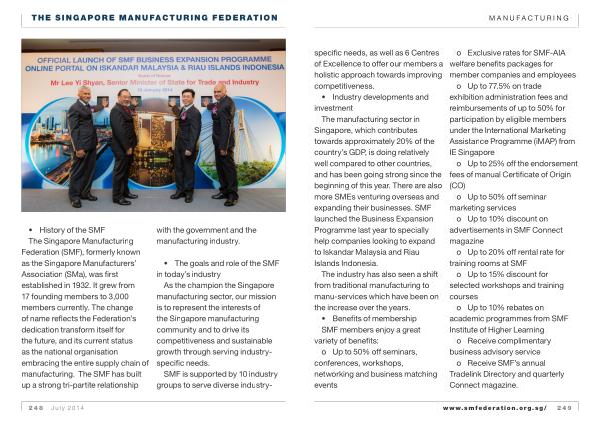 • History of the SMF The Singapore Manufacturing Federation ( SMF ), formerly known as the Singapore Manufacturers ’ Association ( SMa ), was first established in 1932 . It grew from 17 founding members to 3,000 members currently . The change of name reflects the Federation ’ s dedication transform itself for the future , and its current status as the national organisation embracing the entire supply chain of manufacturing . The SMF has built up a strong tri-partite relationship with the government and the manufacturing industry .