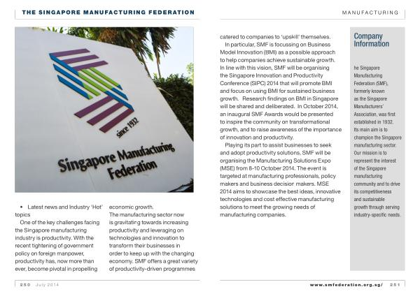he Singapore Manufacturing Federation ( SMF ), formerly known as the Singapore Manufacturers ’ Association , was first established in 1932 . Its main aim is to champion the Singapore manufacturing sector . Our mission is to represent the interest of the Singapore manufacturing community and to drive its competitiveness and sustainable growth through serving industry-specific needs .
