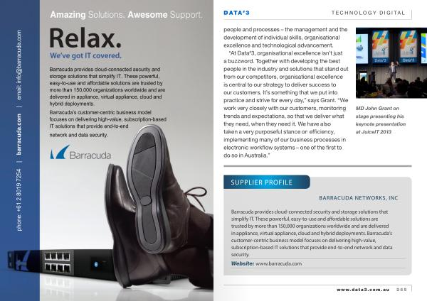 Barracuda provides cloud-connected security and storage solutions that simplify IT . These powerful , easy-to-use and affordable solutions are trusted by more than 150,000 organizations worldwide and are delivered in appliance , virtual appliance , cloud and hybrid deployments . Barracuda ’ s customer-centric business model focuses on delivering high-value , subscription-based IT solutions that provide end-to-end network and data security . Website : www . barracuda . com