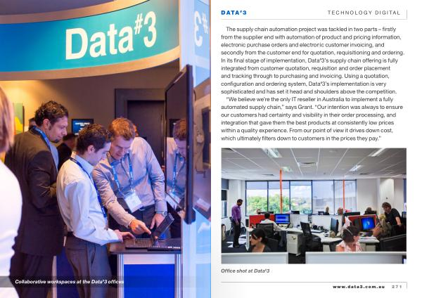 The supply chain automation project was tackled in two parts – firstly from the supplier end with automation of product and pricing information , electronic purchase orders and electronic customer invoicing , and secondly from the customer end for quotation , requisitioning and ordering . In its final stage of implementation , Data # 3 ’ s supply chain offering is fully integrated from customer quotation , requisition and order placement and tracking through to purchasing and invoicing . Using a quotation , configuration and ordering system , Data # 3 ’ s implementation is very sophisticated and has set it head and shoulders above the competition .