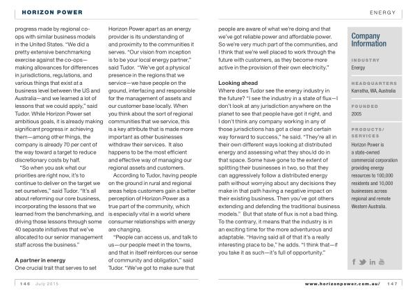 progress made by regional coops with similar business models in the United States . “ We did a pretty extensive benchmarking exercise against the co-ops — making allowances for differences in jurisdictions , regulations , and various things that exist at a business level between the US and Australia — and we learned a lot of lessons that we could apply ,” said Tudor . While Horizon Power set ambitious goals , it is already making significant progress in achieving them — among other things , the company is already 70 per cent of the way toward a target to reduce discretionary costs by half .