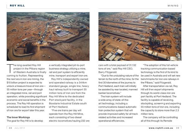 The long awaited Roy Hill project in the Pilbara region of Western Australia is finally coming to fruition . Representing the next era in iron ore mining , the $ 10 billion project is expected to unlock a treasure trove of iron ore — 55 million tons per year — through an integrated mine , rail and port operation , while providing significant economic and social benefits in the process . The Roy Hill operation is scheduled to load its first shipment of iron ore for export later this year .